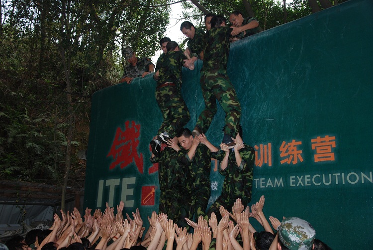 (六)畢業(yè)墻。全體團隊的每個成員,不借助身體外的任何工具,齊心協(xié)力,在規(guī)定的時間內(nèi),翻越一面高達4.2米的光滑墻面。這是本次特訓(xùn)營的最后一個項目,是對全體參訓(xùn)團隊整合團隊增強士氣和凝聚力最后的一個考驗。