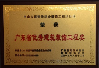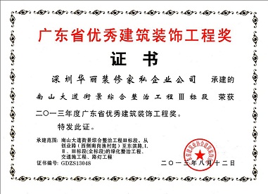 集團(tuán)參股企業(yè)華麗裝修家私企業(yè)公司承建的“南山大道街景綜合整治工程Ⅲ標(biāo)段”繼獲得2012年度深圳裝飾工程金鵬獎(jiǎng)(公裝類)后捷報(bào)頻傳,再一次榮獲廣東省建筑裝飾工程最高榮譽(yù)獎(jiǎng)“廣東省優(yōu)秀建筑裝飾工程獎(jiǎng)”(以下簡稱“省優(yōu)”)。2013年10月廣東省建筑業(yè)協(xié)會建筑裝飾分會授予華麗公司“省優(yōu)”獎(jiǎng)杯、牌匾及證書。該工程經(jīng)深圳市裝飾行業(yè)協(xié)會的專家嚴(yán)格檢查評比之后擇優(yōu)推薦到廣東省建筑業(yè)協(xié)會建筑裝飾分會,由省建筑業(yè)協(xié)會建筑裝飾分會組織廣東省內(nèi)的專家對“省優(yōu)”申報(bào)資料及現(xiàn)場進(jìn)行嚴(yán)格的考察評比,經(jīng)“省優(yōu)”評委會評審?fù)ㄟ^,華麗公司再次榮獲殊榮。