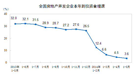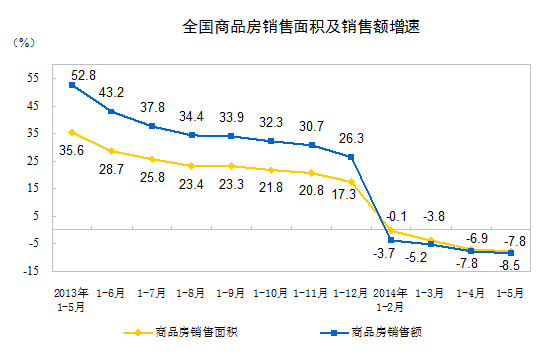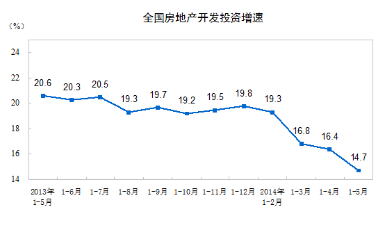 2014年1-5月份,全國房地產(chǎn)開發(fā)投資30739億元,同比名義增長14.7%,增速比1-4月份回落1.7個(gè)百分點(diǎn)。其中,住宅投資21043億元,增長14.6%,增速回落2個(gè)百分點(diǎn),占房地產(chǎn)開發(fā)投資的比重為68.5%。